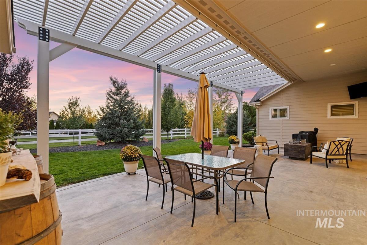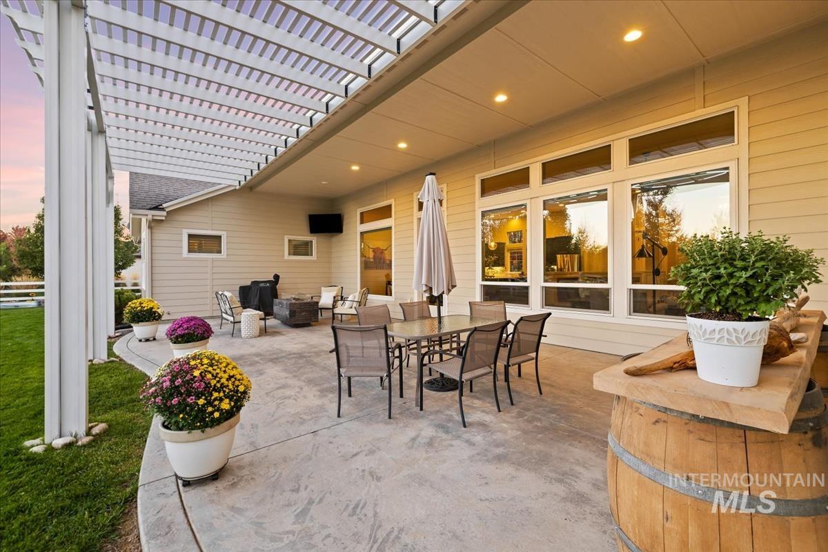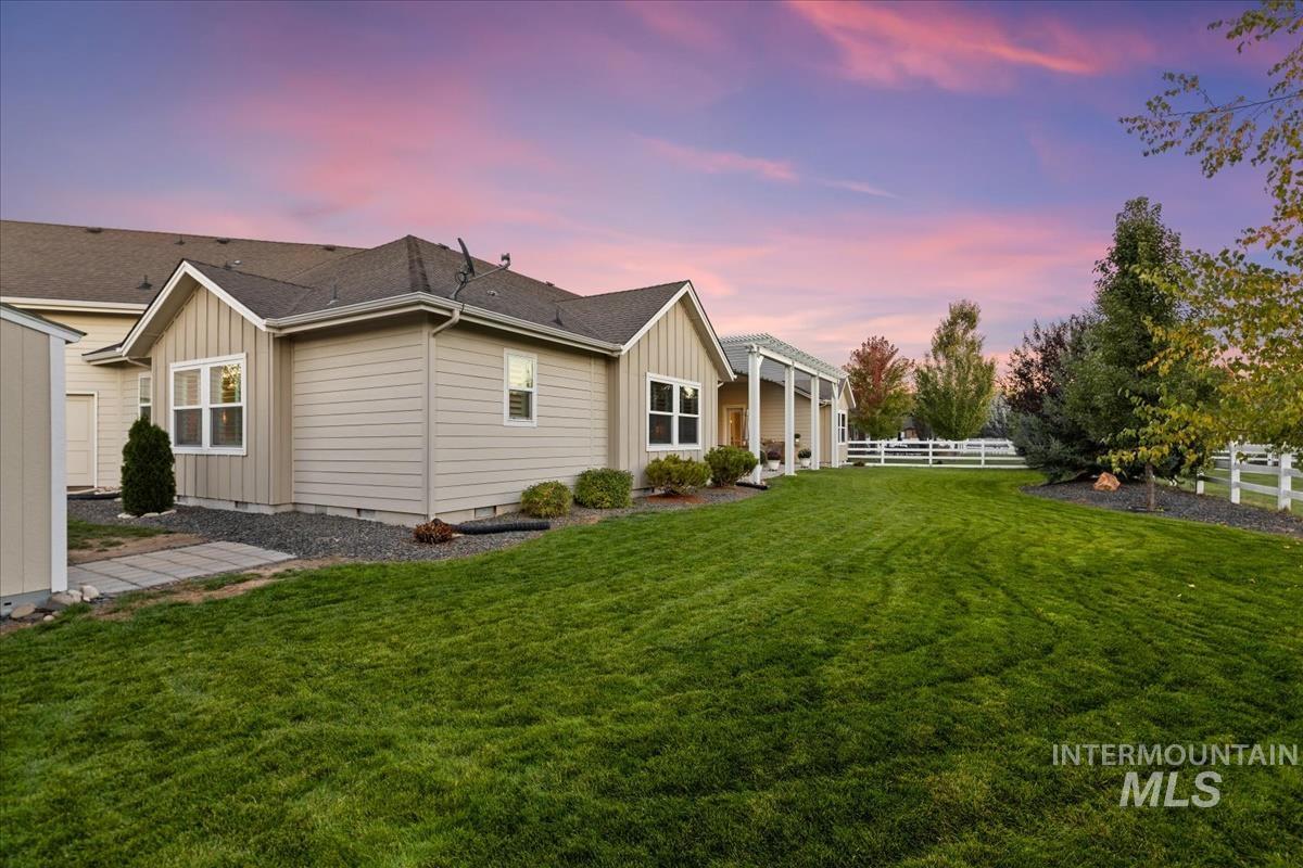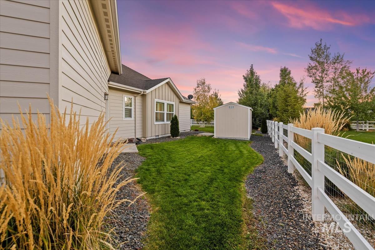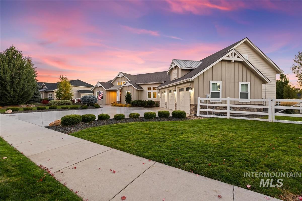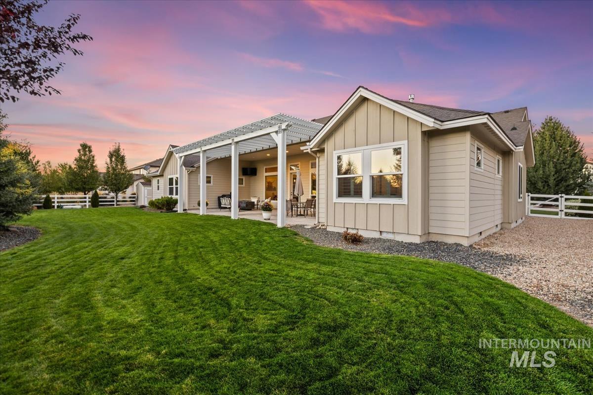 Enjoy sweeping views of the Idaho sunset from the back porch in this better-than new custom built home in Henry's Fork neighborhood. The large open concept living space is perfect for comfortable every day living as well as entertaining! Live in style both indoors & outdoors on this homesite that backs onto common area with beautiful mature foliage. New large 12' tall pergola & ample patio space. The home features 4 huge bedrooms and 4 bathrooms, w/ the 4th bedroom situated away from the others, & convenient to a full bath. It's been used as an office or guest space. Jack-and-jill bathroom with separate vanity areas. Office space around the corner from kitchen, & large bonus room w/ full bathroom. Lg. primary bedroom w/ arbor door for back patio access. Primary bathroom w/ dual vanities, garden soaker tub, tile walk-in shower. Home also includes remote controlled blinds, plantation shutters, a central vacuum system, an oversized three car garage, & a garden shed. Henry's Fork has a pool and walking paths.
