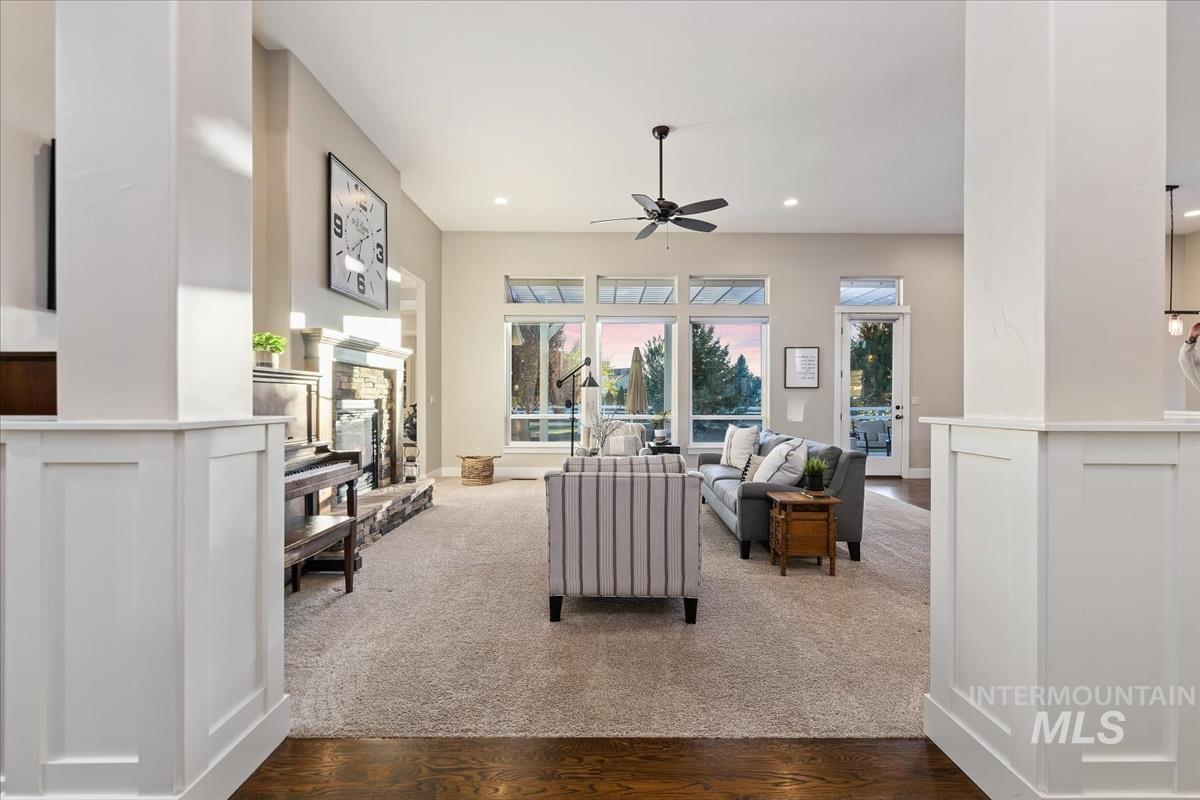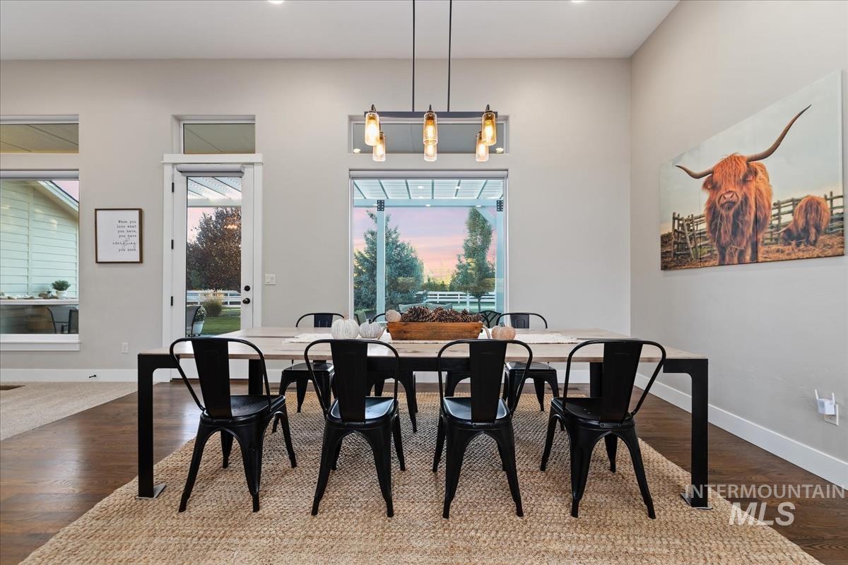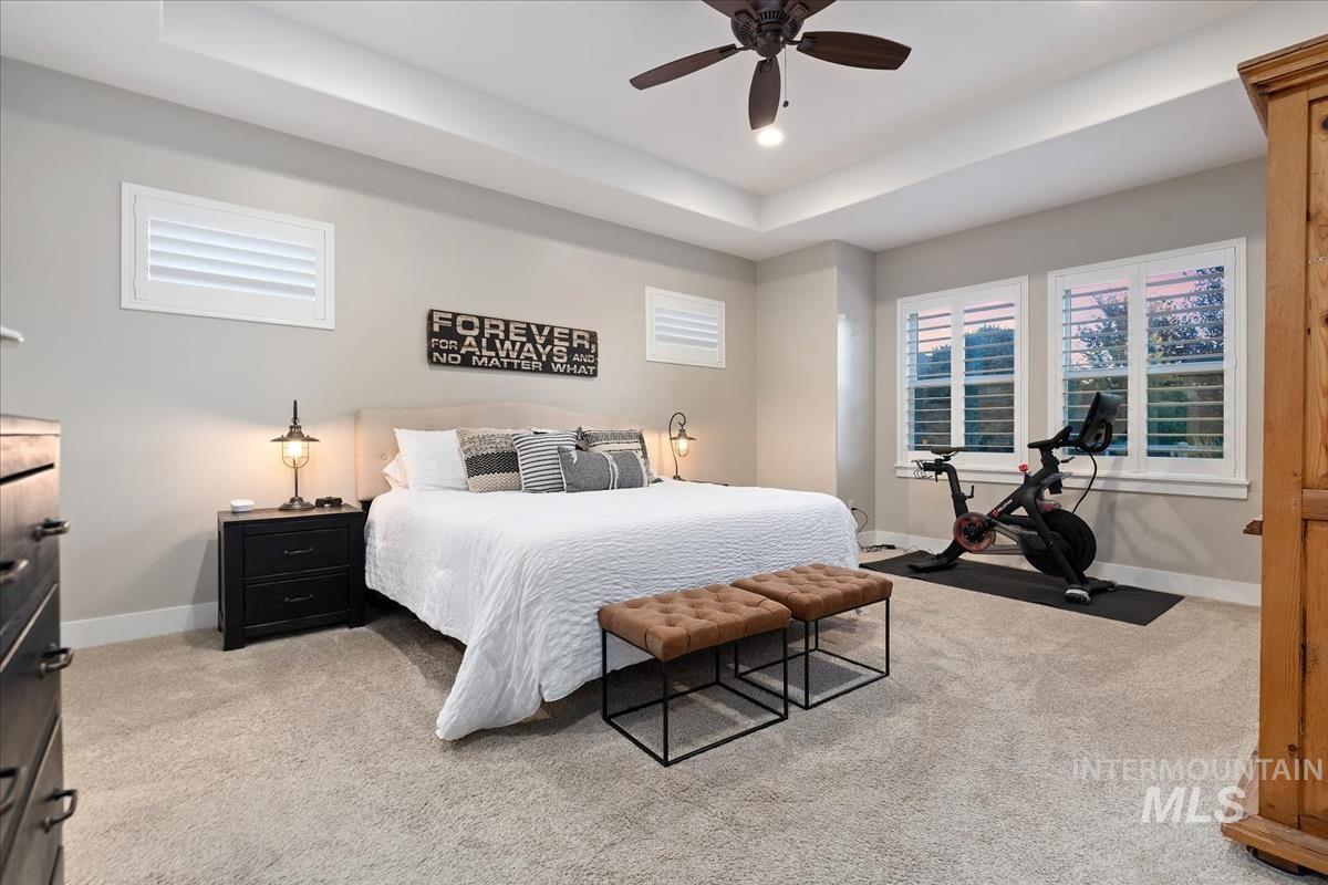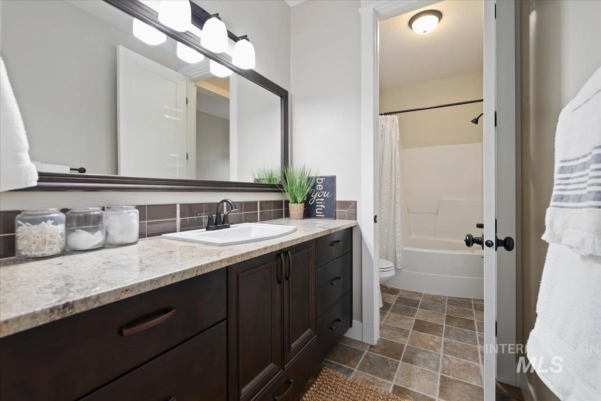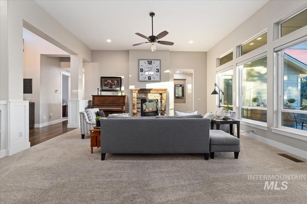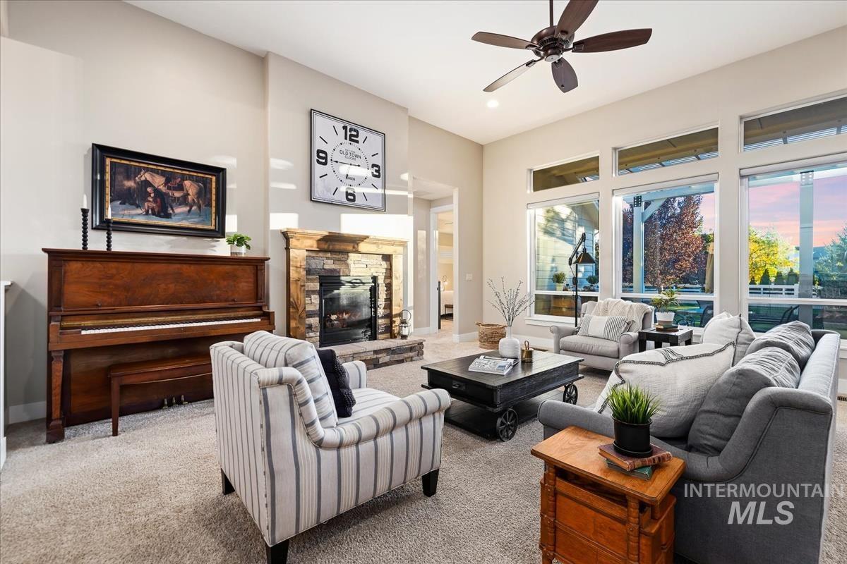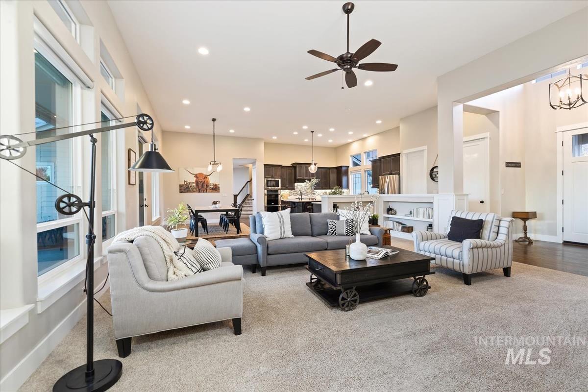 Enjoy sweeping views of the Idaho sunset from the back porch in this better-than new custom built home in Henry's Fork neighborhood. The large open concept living space is perfect for comfortable every day living as well as entertaining! Live in style both indoors & outdoors on this homesite that backs onto common area with beautiful mature foliage. New large 12' tall pergola & ample patio space. The home features 4 huge bedrooms and 4 bathrooms, w/ the 4th bedroom situated away from the others, & convenient to a full bath. It's been used as an office or guest space. Jack-and-jill bathroom with separate vanity areas. Office space around the corner from kitchen, & large bonus room w/ full bathroom. Lg. primary bedroom w/ arbor door for back patio access. Primary bathroom w/ dual vanities, garden soaker tub, tile walk-in shower. Home also includes remote controlled blinds, plantation shutters, a central vacuum system, an oversized three car garage, & a garden shed. Henry's Fork has a pool and walking paths.