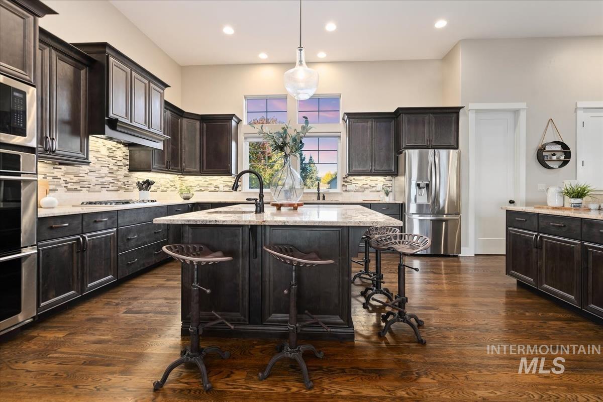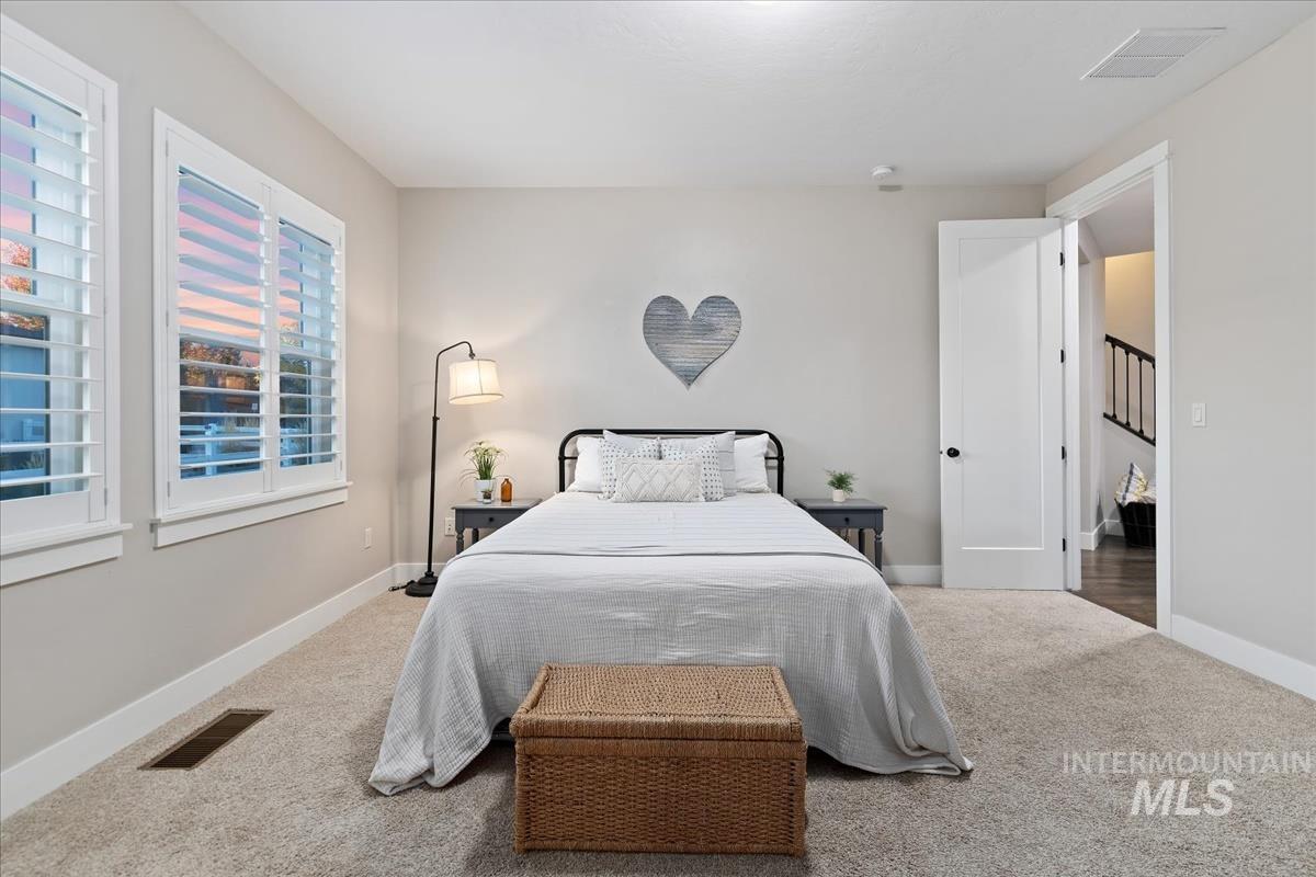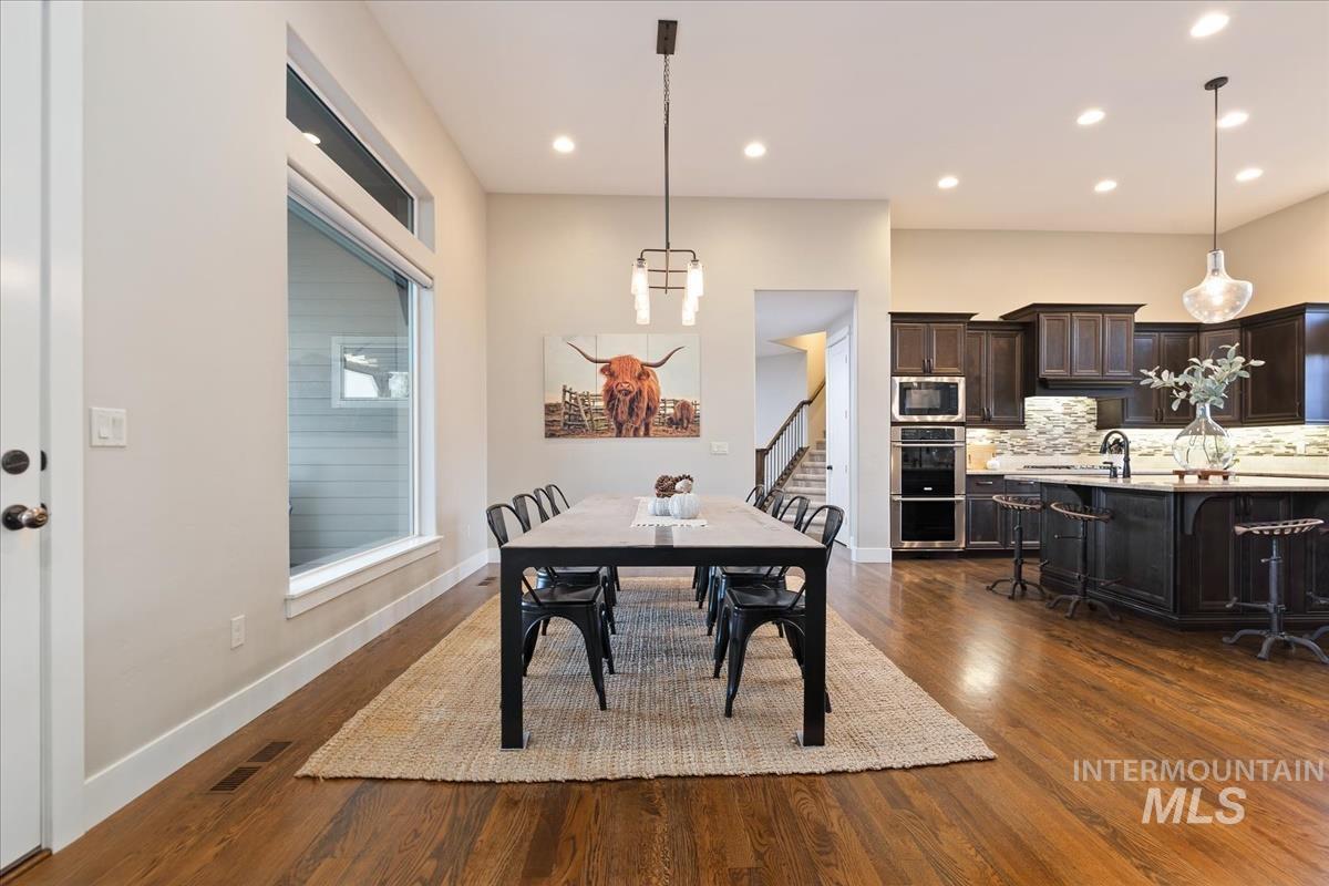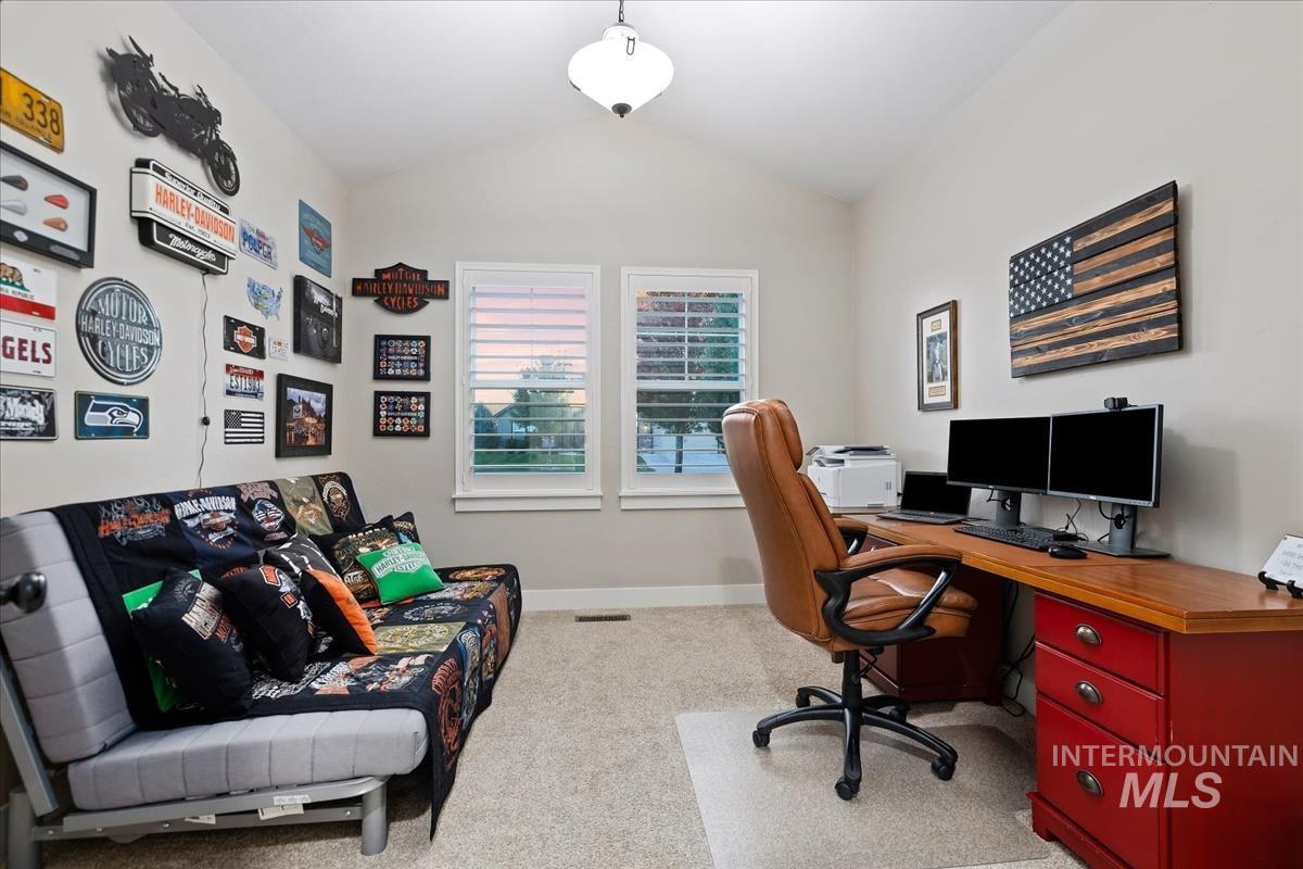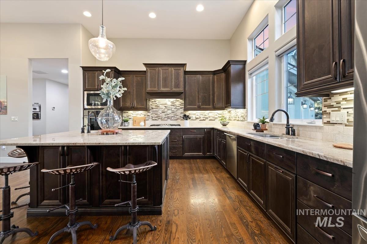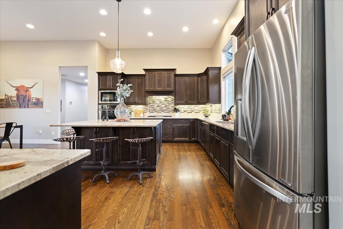Enjoy sweeping views of the Idaho sunset from the back porch in this better-than new custom built home in Henry's Fork neighborhood. The large open concept living space is perfect for comfortable every day living as well as entertaining! Live in style both indoors & outdoors on this homesite that backs onto common area with beautiful mature foliage. New large 12' tall pergola & ample patio space. The home features 4 huge bedrooms and 4 bathrooms, w/ the 4th bedroom situated away from the others, & convenient to a full bath. It's been used as an office or guest space. Jack-and-jill bathroom with separate vanity areas. Office space around the corner from kitchen, & large bonus room w/ full bathroom. Lg. primary bedroom w/ arbor door for back patio access. Primary bathroom w/ dual vanities, garden soaker tub, tile walk-in shower. Home also includes remote controlled blinds, plantation shutters, a central vacuum system, an oversized three car garage, & a garden shed. Henry's Fork has a pool and walking paths.