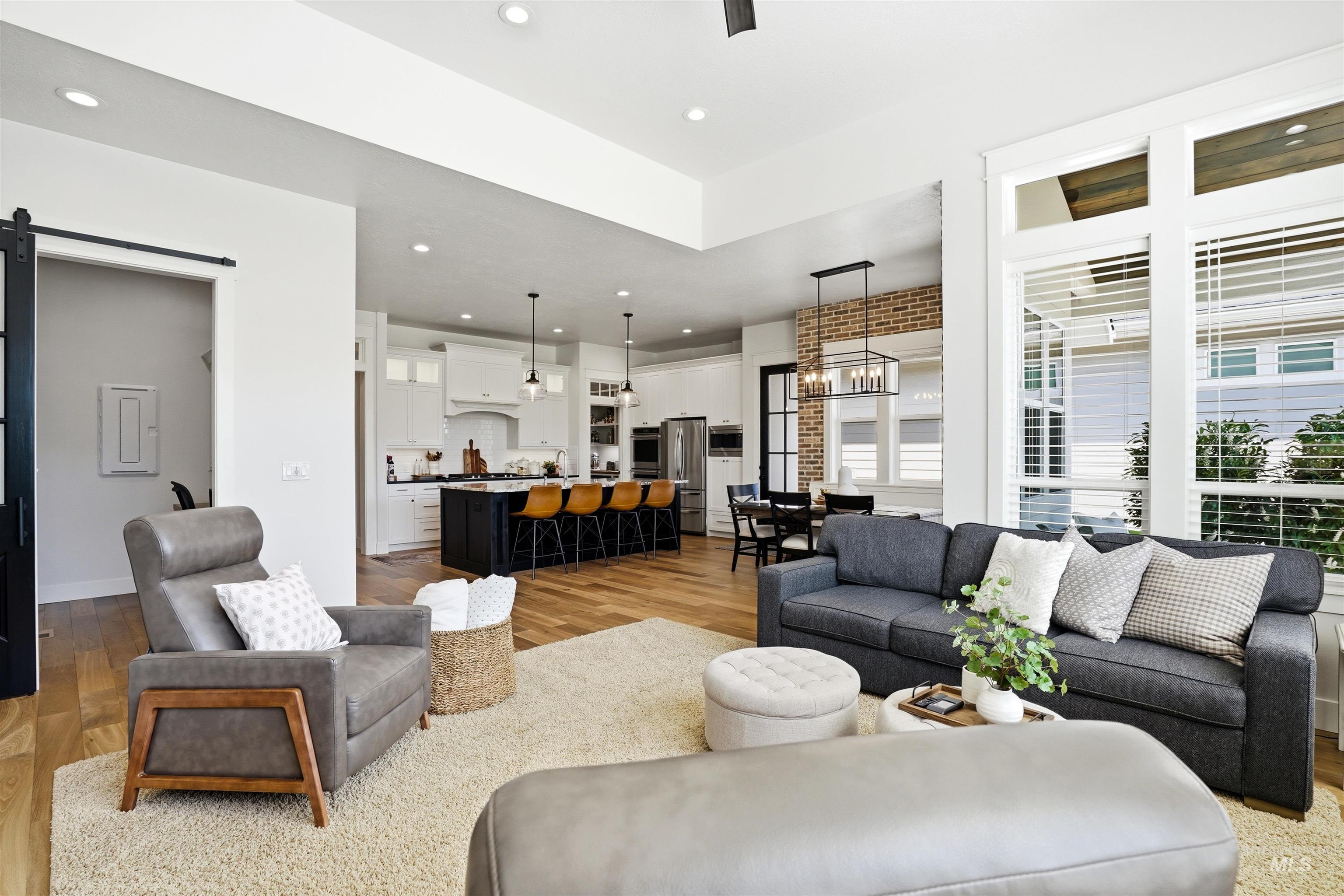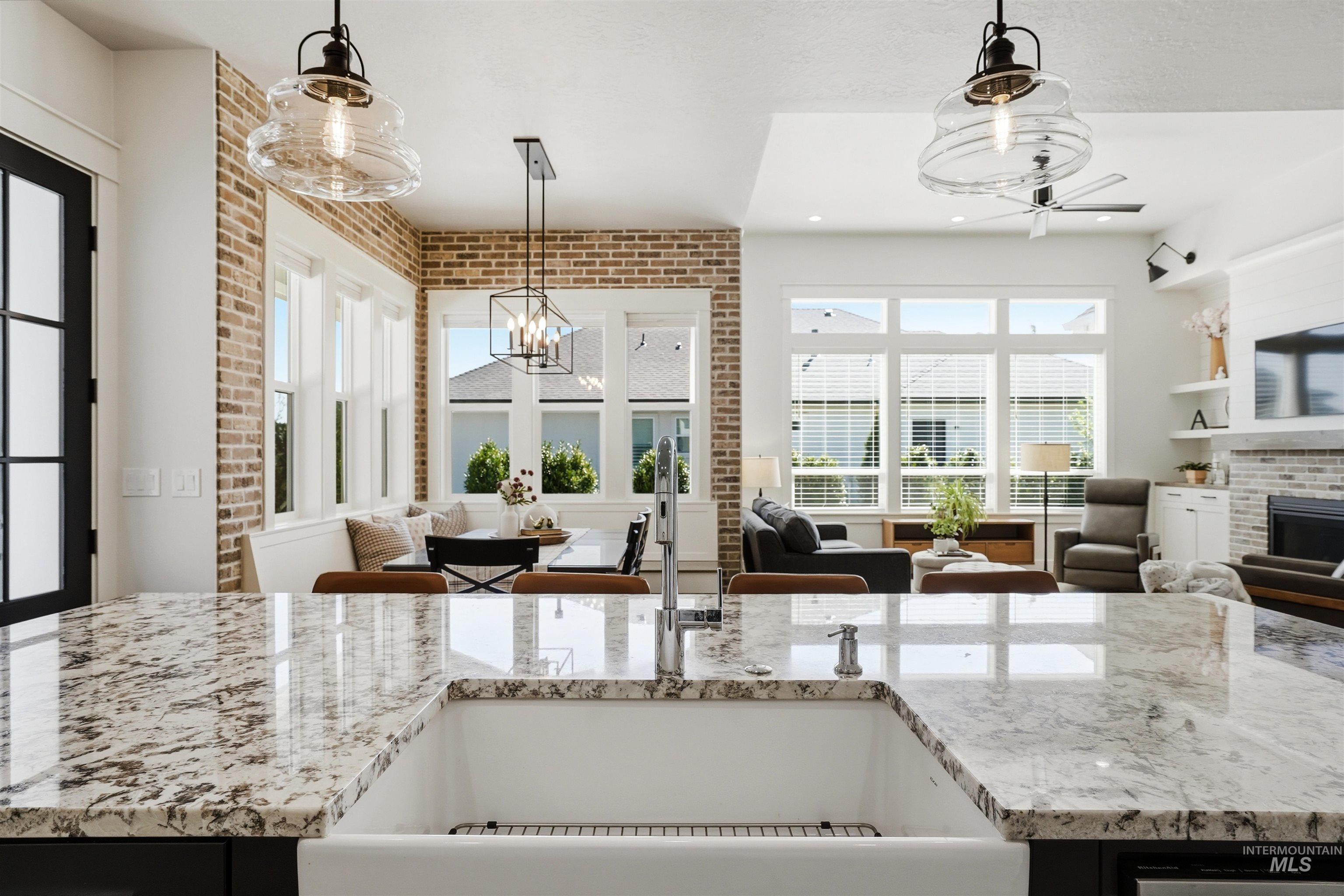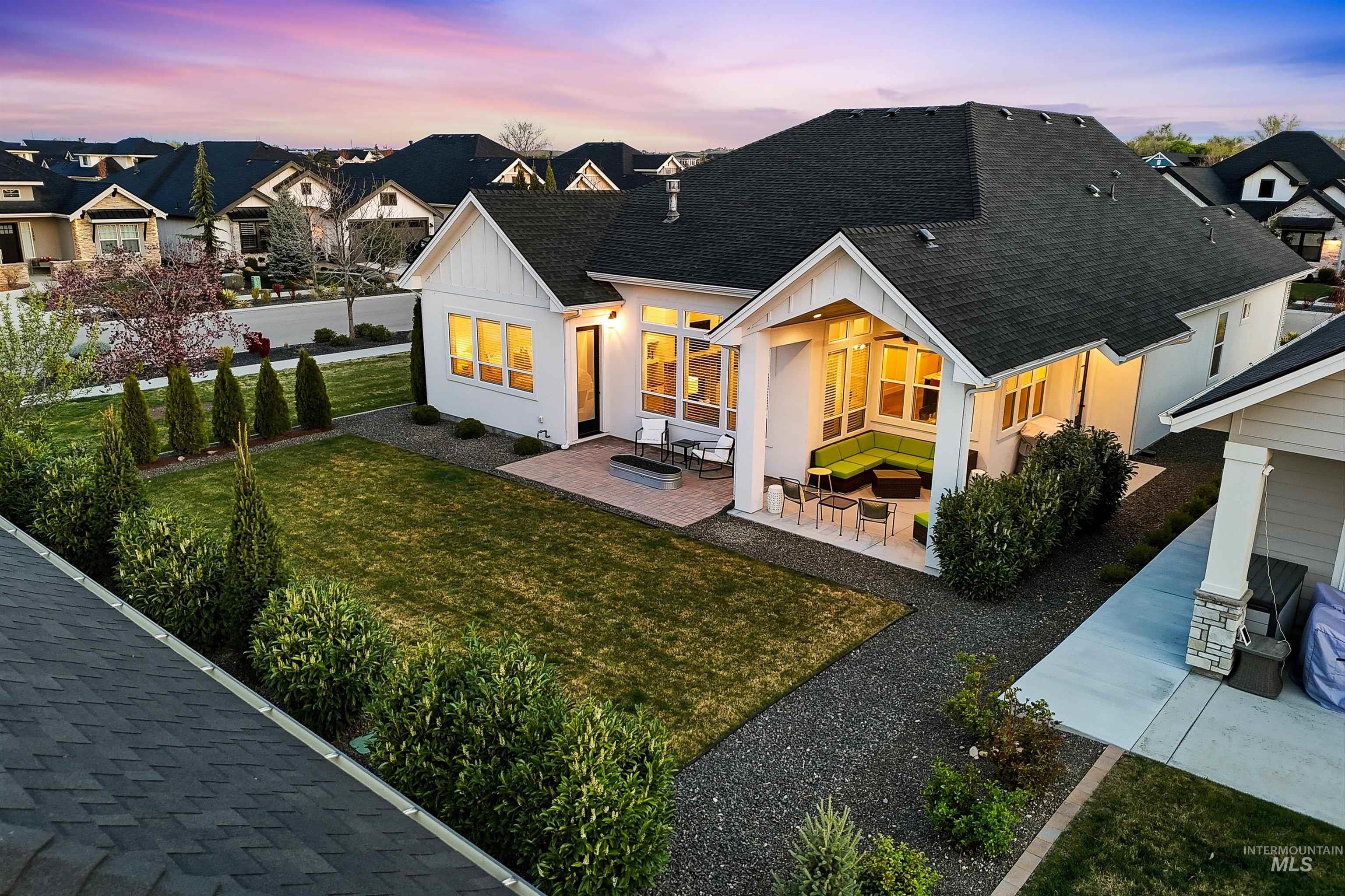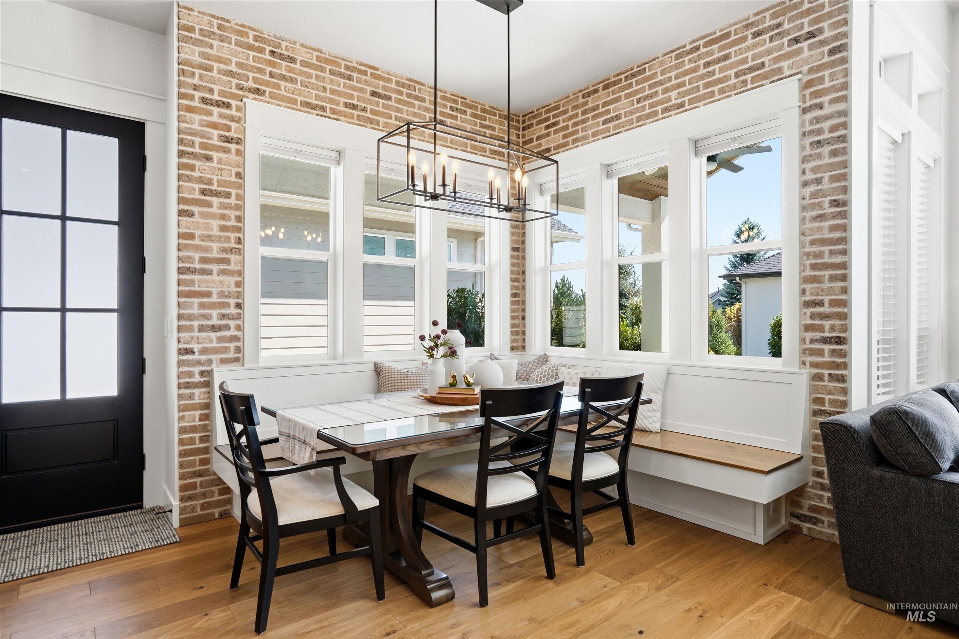Custom Harbor Homes build in Eagle's sought-after Legacy subdivision! This thoughtfully designed home features a gourmet kitchen with granite countertops, gas range, double ovens, and a charming brick-accented banquette with built-in seating for up to 10--perfect for gathering. Custom shiplap and board-and-batten feature walls add warmth and character throughout. Vaulted ceilings elevate the main living area, primary suite (with beam detail), and one secondary bedroom, creating a bright, open feel. The home also includes a convenient pocket office for work or organization. Enjoy outdoor living on the covered patio with a vaulted wood shiplap ceiling. Additional highlights include a whole-home water filtration system, HERS energy certification, and a 3-car garage with a tandem bay. Located in Legacy, offering an executive golf course, miles of walking paths, 3 pools, parks, and a soccer field--this is Idaho living at its best!