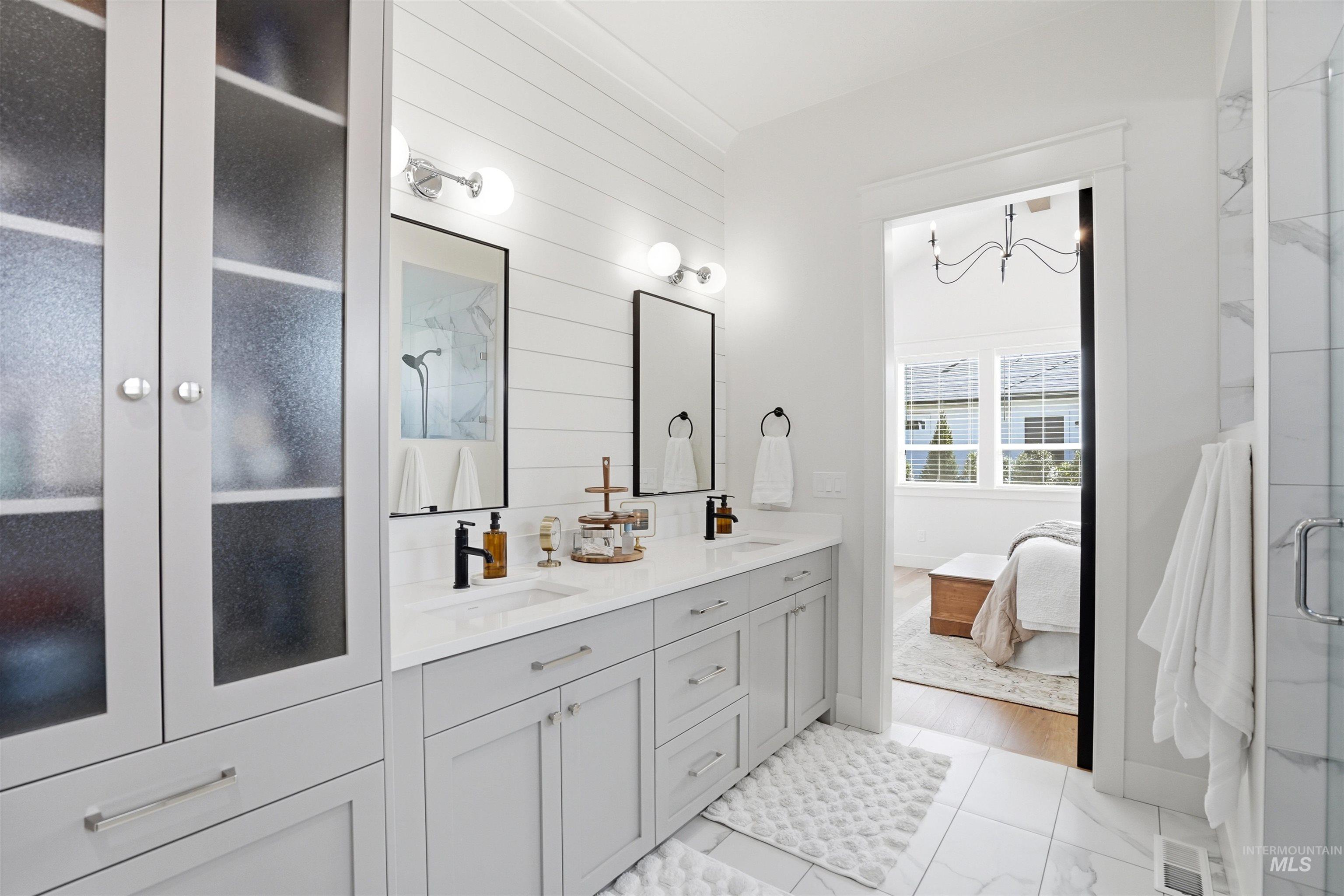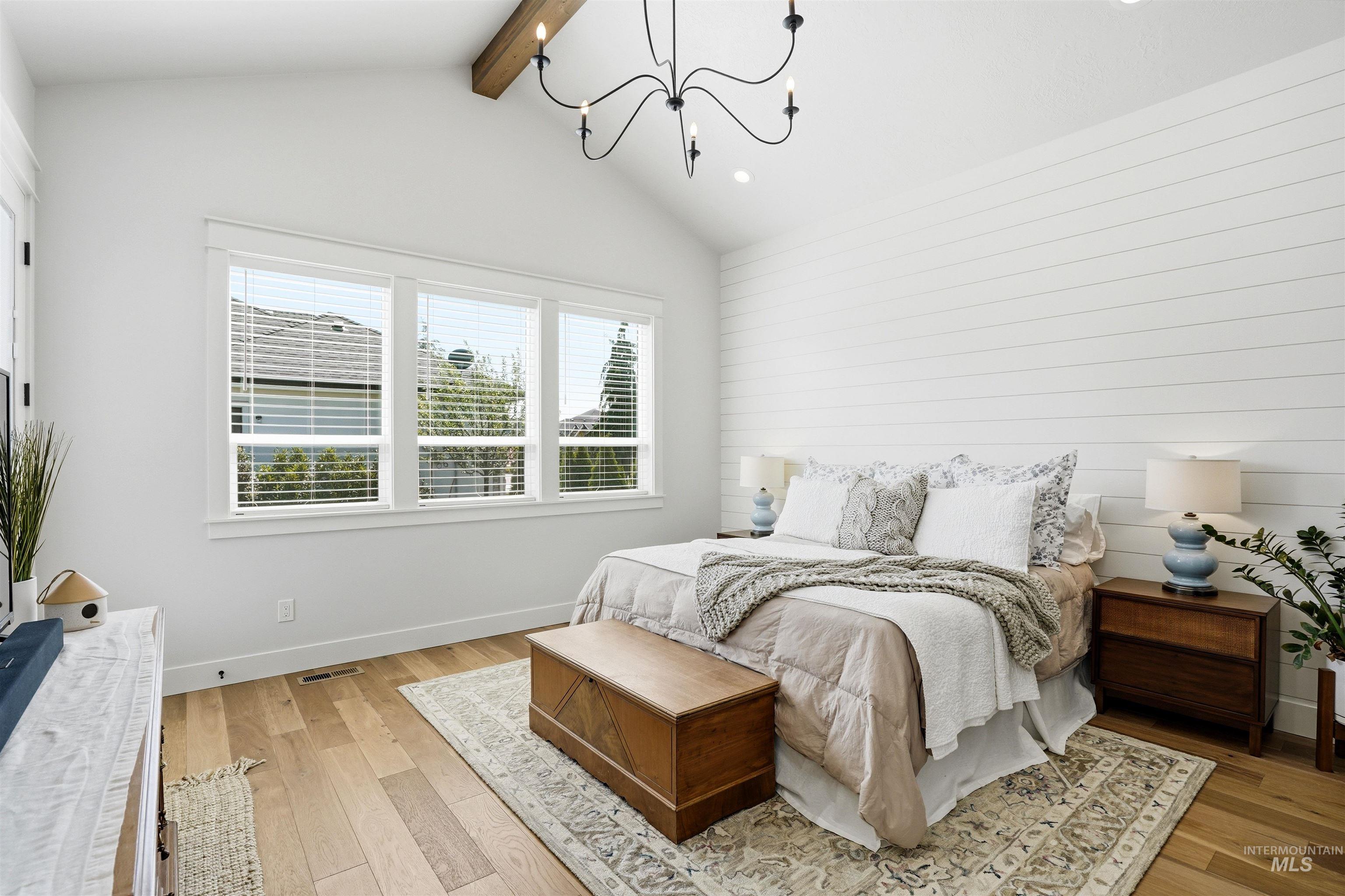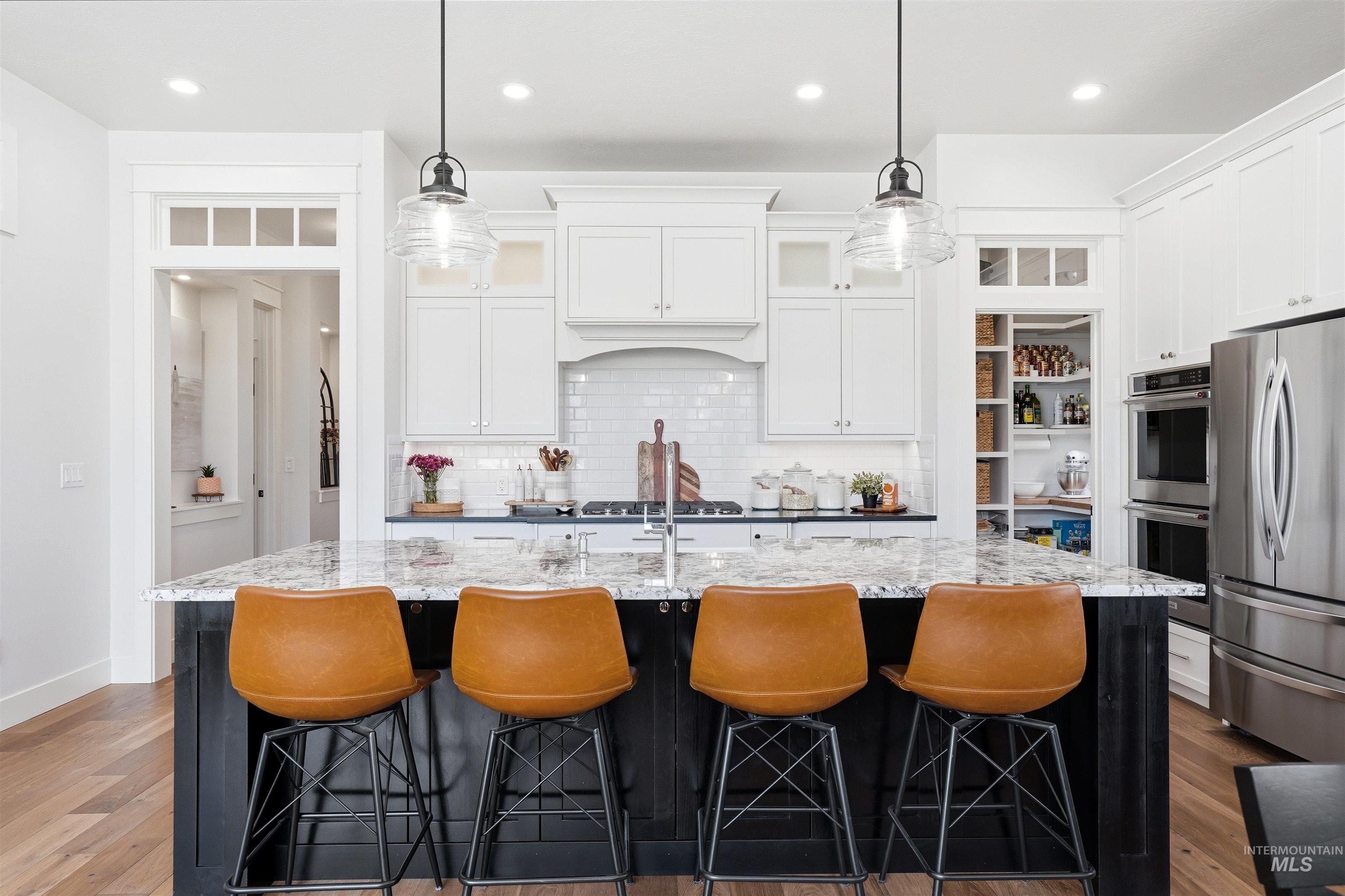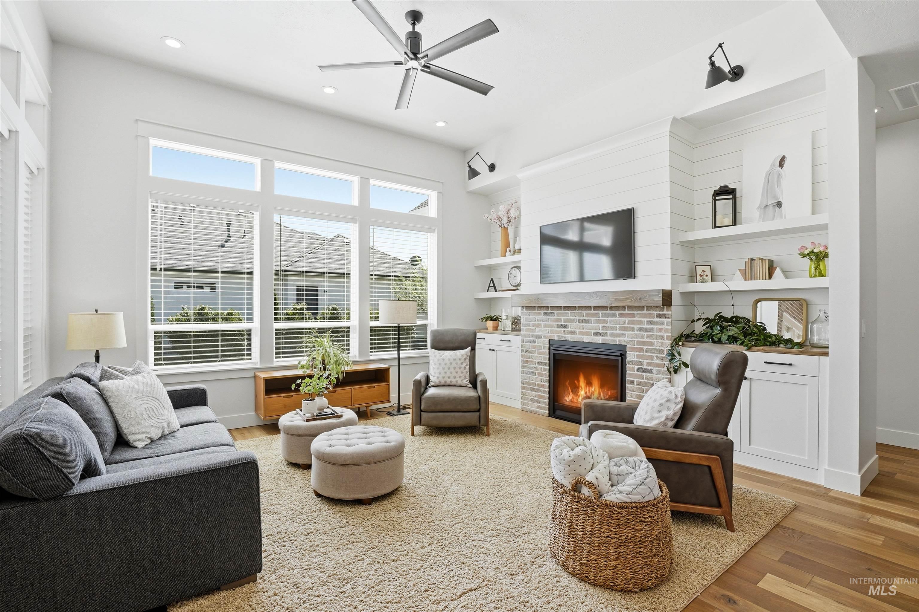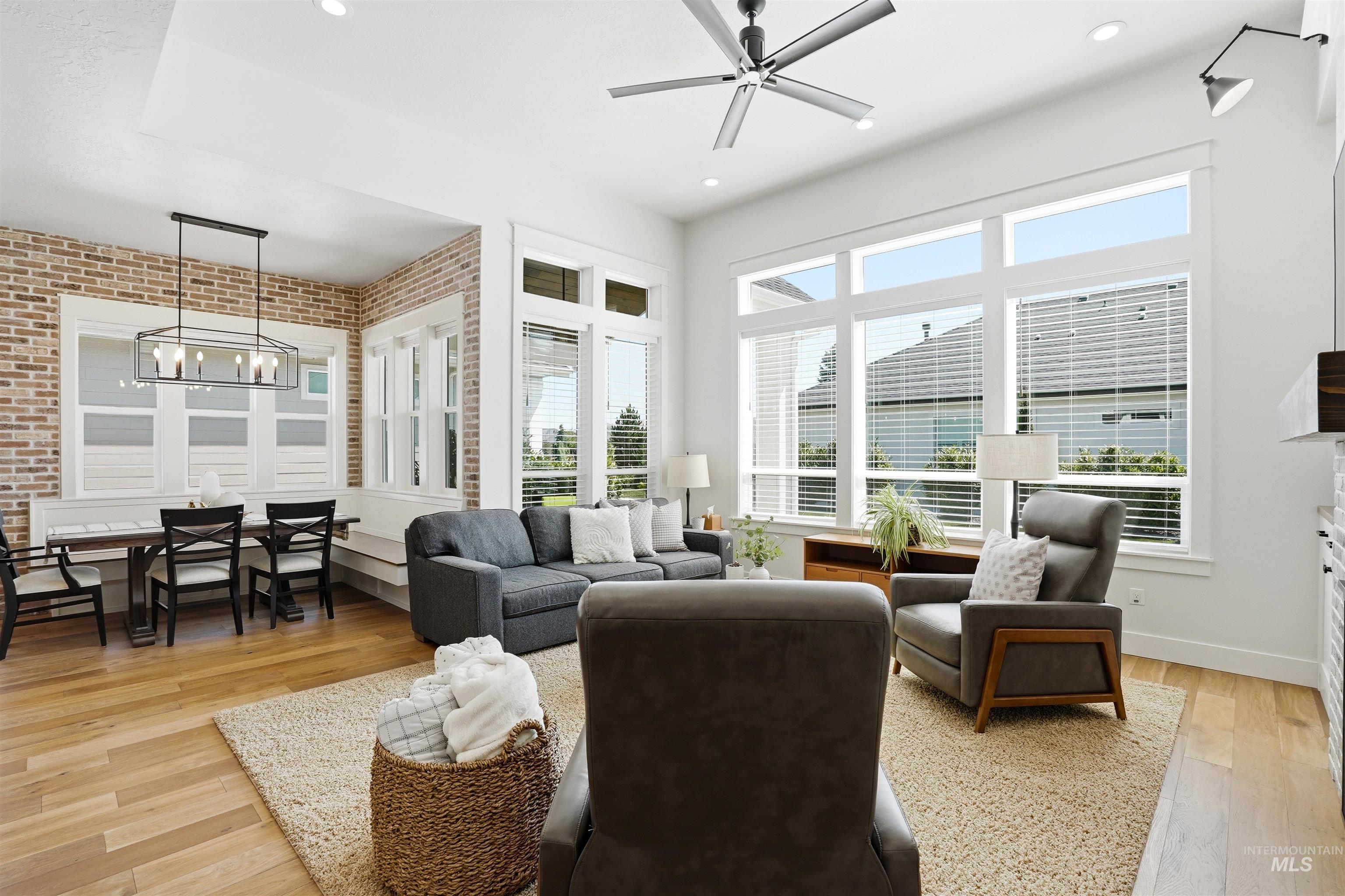 Custom Harbor Homes build in Eagle's sought-after Legacy subdivision! This thoughtfully designed home features a gourmet kitchen with granite countertops, gas range, double ovens, and a charming brick-accented banquette with built-in seating for up to 10--perfect for gathering. Custom shiplap and board-and-batten feature walls add warmth and character throughout. Vaulted ceilings elevate the main living area, primary suite (with beam detail), and one secondary bedroom, creating a bright, open feel. The home also includes a convenient pocket office for work or organization. Enjoy outdoor living on the covered patio with a vaulted wood shiplap ceiling. Additional highlights include a whole-home water filtration system, HERS energy certification, and a 3-car garage with a tandem bay. Located in Legacy, offering an executive golf course, miles of walking paths, 3 pools, parks, and a soccer field--this is Idaho living at its best!