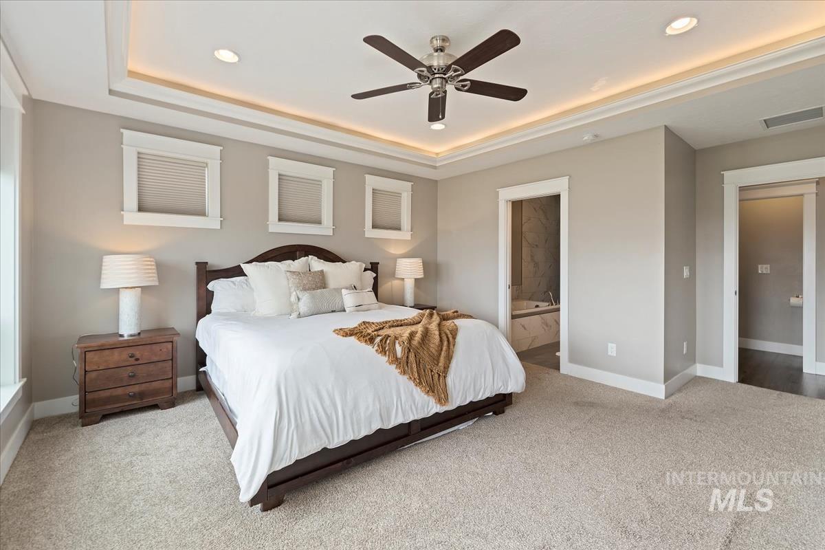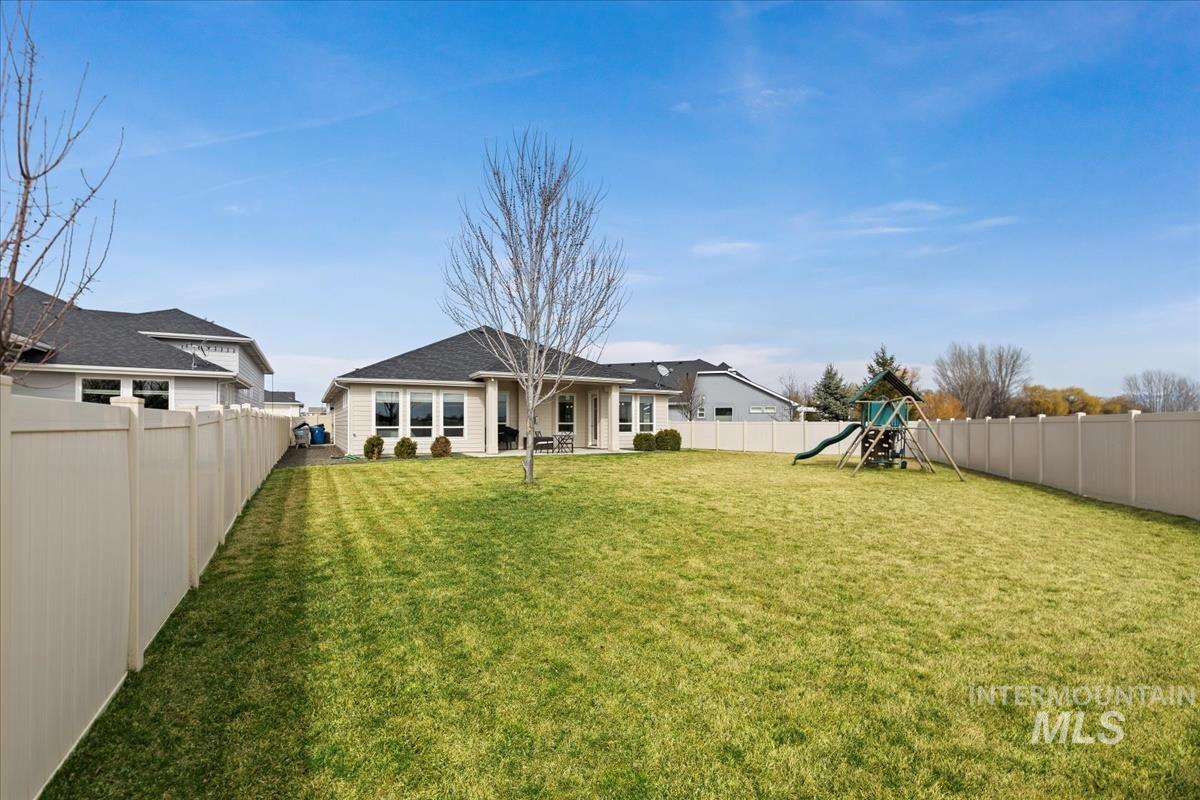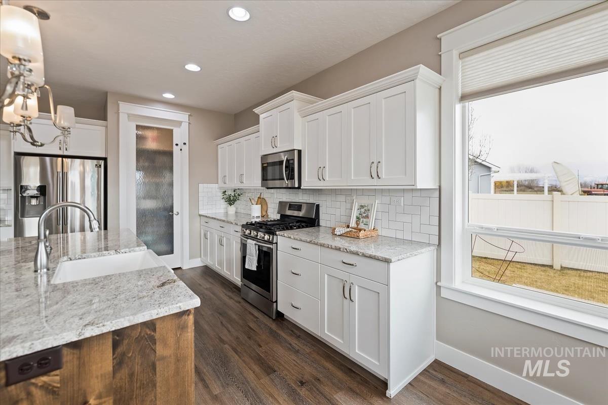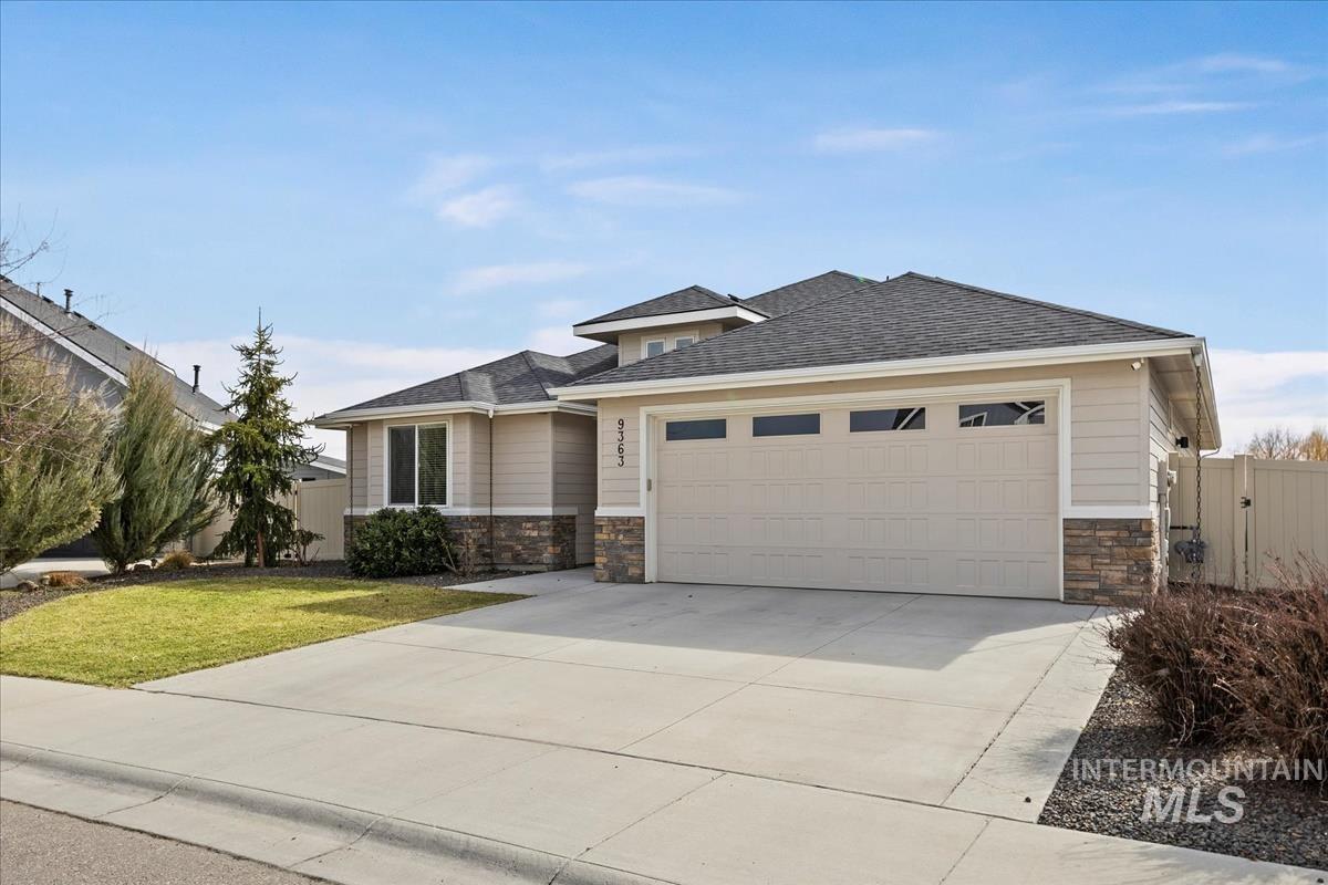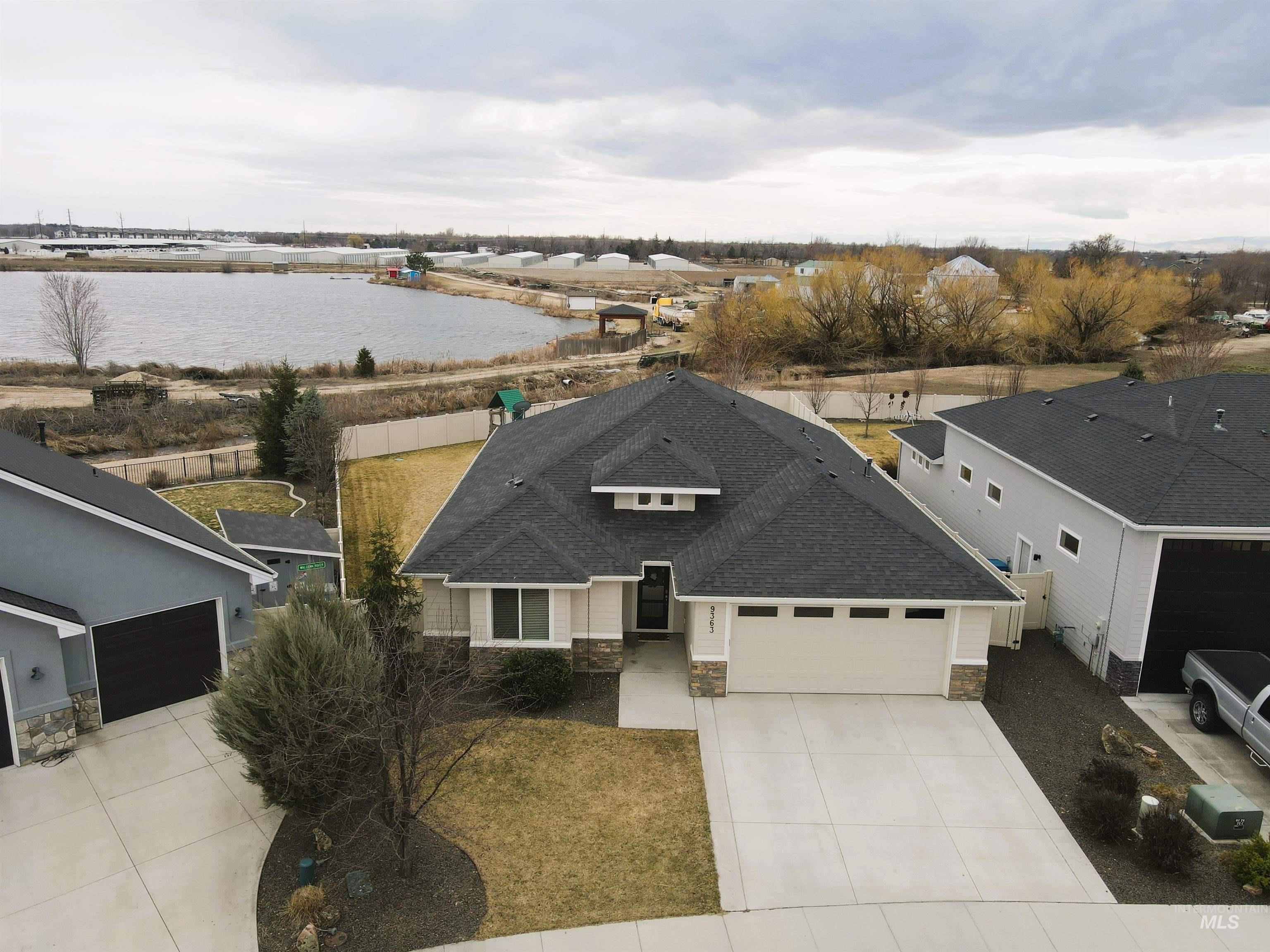 Welcome to this amazing 3-bedroom, 2.5-bathroom home with views! Nestled on a .237-acre lot, this 2,089 sqft home offers privacy and tranquility with no backyard neighbors--just the view of Bogus Basin and, directly behind you, a pond. The open-concept layout creates a warm atmosphere, centered around a white kitchen with modern finishes, ample counter space, and a large island with a farmhouse sink. The cozy fireplace in the living area adds charm. The primary suite features a private door to the back patio, a spa-like bathroom with a walk-in shower, garden soaker tub, and dual vanities, plus a large walk-in closet that connects to the laundry room, complete with a lot of cabinetry and a built-in mini desk. 2 additional bedrooms with a Jack-and-Jill bathroom are located on the opposite side of the home. Enjoy the covered patio, hang out in the large yard and enjoy views of Bogus and the pond. With a 2-car garage and a prime location in a quiet neighborhood, this home is a Gem!