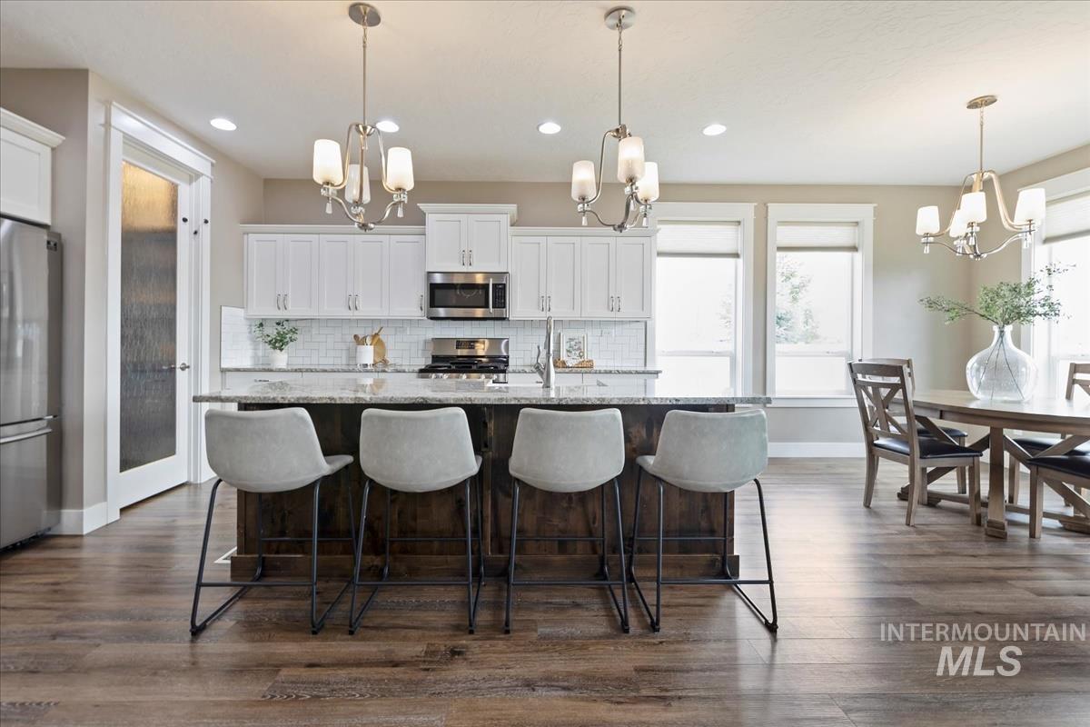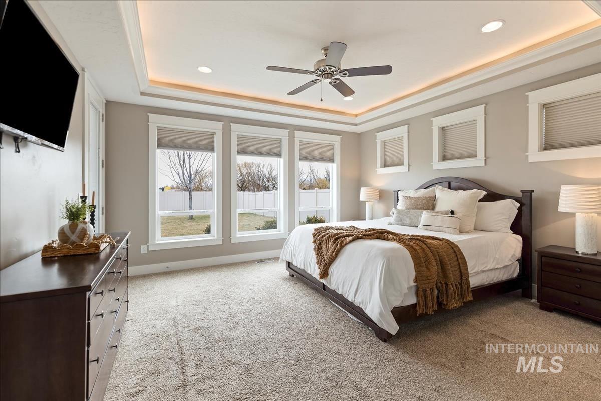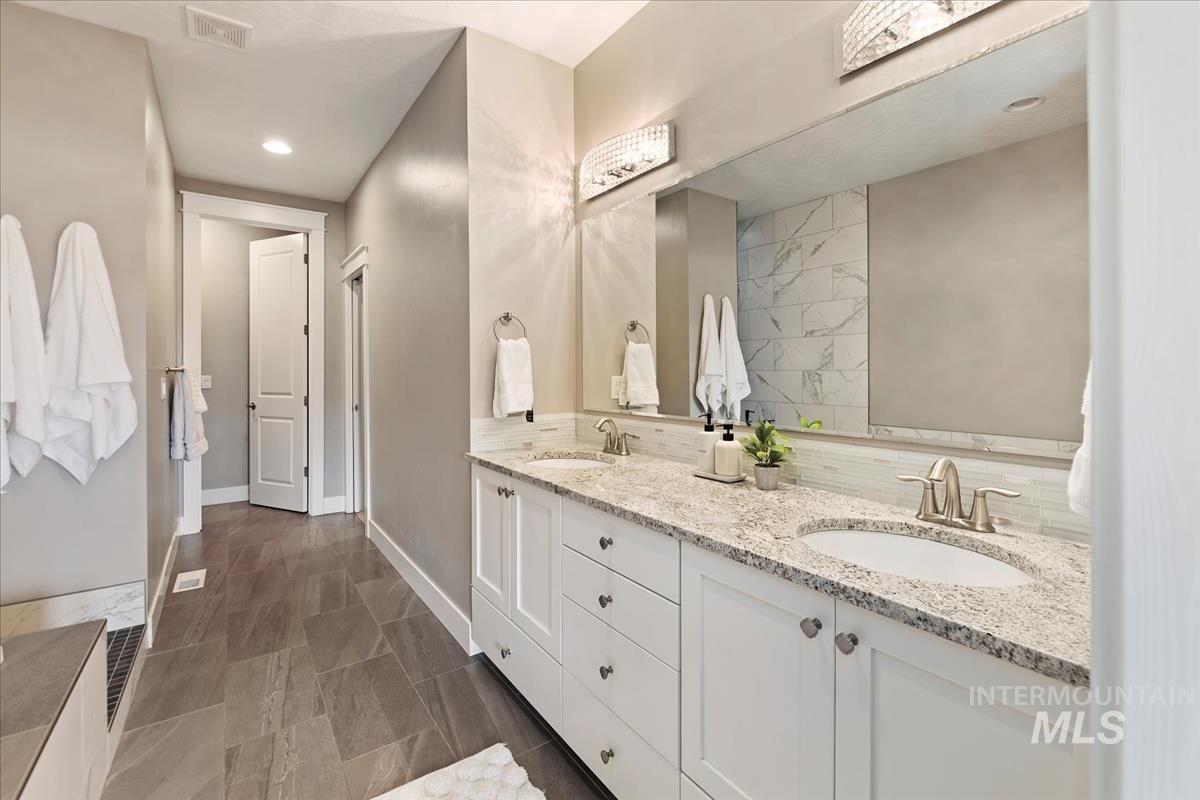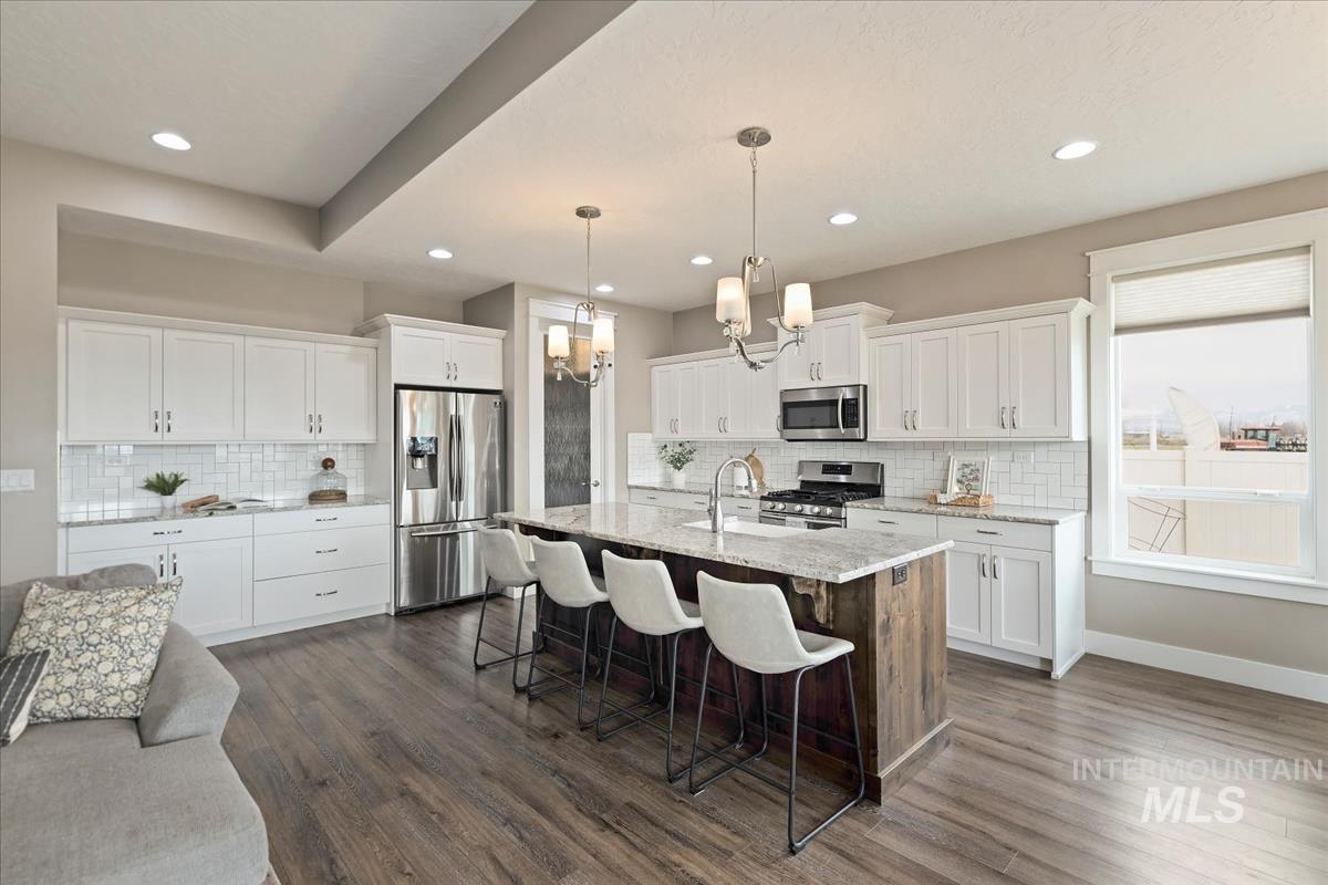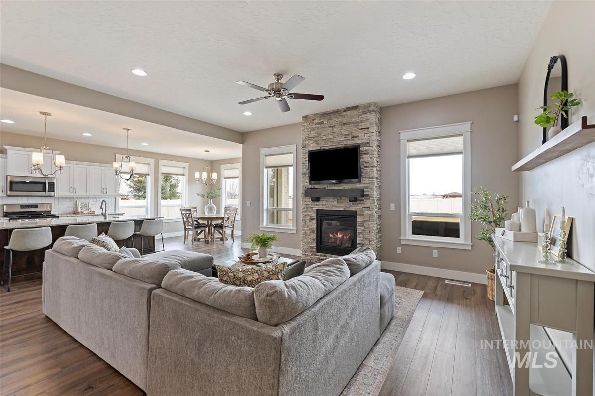 Welcome to this amazing 3-bedroom, 2.5-bathroom home with views! Nestled on a .237-acre lot, this 2,089 sqft home offers privacy and tranquility with no backyard neighbors--just the view of Bogus Basin and, directly behind you, a pond. The open-concept layout creates a warm atmosphere, centered around a white kitchen with modern finishes, ample counter space, and a large island with a farmhouse sink. The cozy fireplace in the living area adds charm. The primary suite features a private door to the back patio, a spa-like bathroom with a walk-in shower, garden soaker tub, and dual vanities, plus a large walk-in closet that connects to the laundry room, complete with a lot of cabinetry and a built-in mini desk. 2 additional bedrooms with a Jack-and-Jill bathroom are located on the opposite side of the home. Enjoy the covered patio, hang out in the large yard and enjoy views of Bogus and the pond. With a 2-car garage and a prime location in a quiet neighborhood, this home is a Gem!